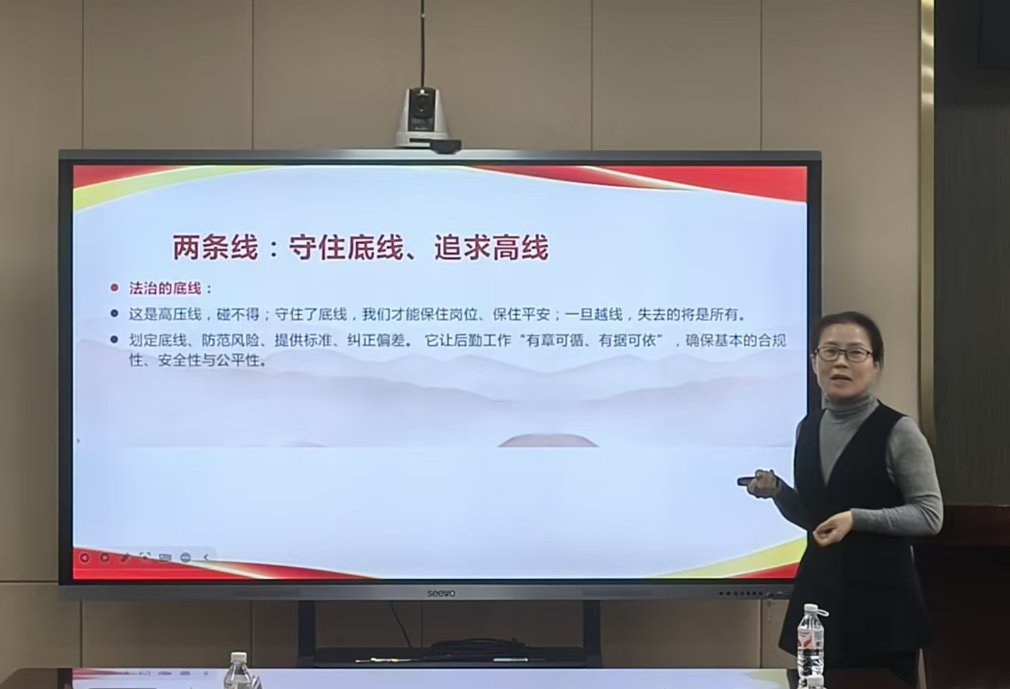 任华玉教授以《守底线 修品德—做让师生安心、学校放心的后勤人》为题,紧扣后勤岗位特点,结合理论阐释与典型案例,为全体党员上了一堂深刻的纪律教育与品德修养课。她讲到,法治是底线,后勤管钱、管物、管工程、管服务,必须严守党纪国法与学校制度,坚决杜绝工程、资产、采购、资金等领域违规违纪行为,做到遇事问法、决策循程序、过程重证据。